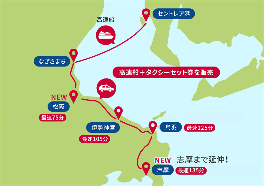 セントレアから高速船で津なぎさまちへ、津なぎさまちから貸切タクシーを利用して伊勢・鳥羽・志摩・松阪へのご旅行を気軽に楽しめる大好評のサービス
